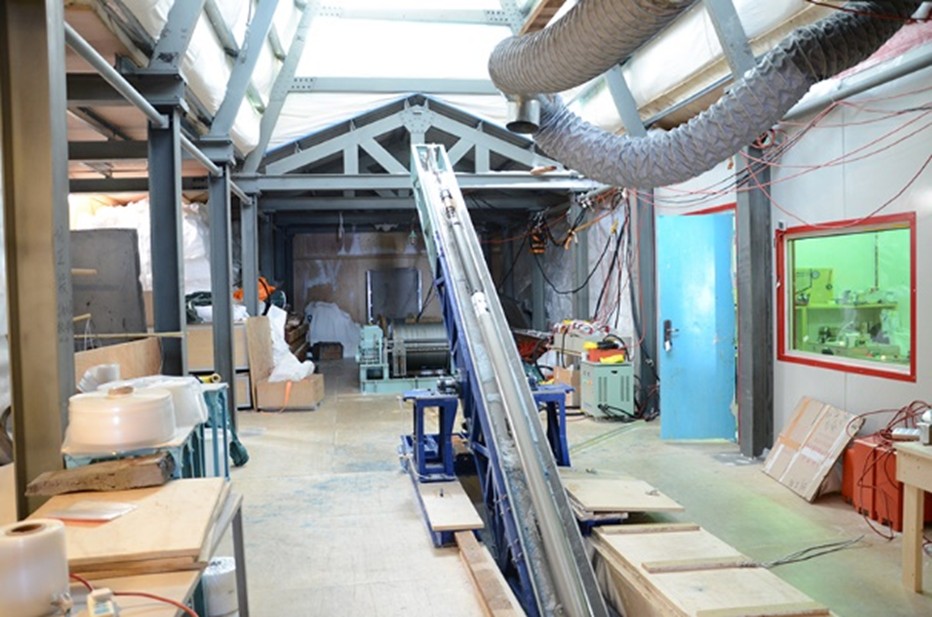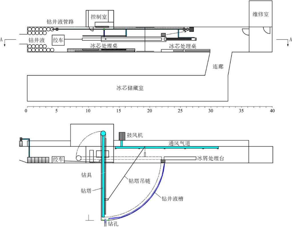 为了在昆仑站建设使用寿命30年以上的深冰芯钻探场地,中国极地研究中心通过借鉴日本Dome Fuji深冰芯钻探的成功经验,场地结构设计为钢结构加强的半地下建筑结构。钻探主场地长×宽×高为40 m×4 m×3 m,采用36 t钢结构螺栓连接为一体框架支撑,底部由木方、木板和聚乙烯泡沫板夹层形成保温地板,屋顶则采用木板和苫布进行遮挡。场地从2009/2010考察季开始建设,并于2010/2011考察季建成主钻探场地,随后又于2015/2016考察季建成冰芯储藏室,从而形成了如图所示的钻探场地。
