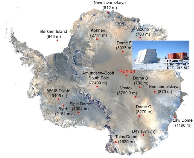 南极昆仑站深冰芯钻孔位于距离Dome A最高点7 km处的中国南极昆仑站(80°25′01″S, 77°06′58″E)(图1),此处海拔4083m,冰厚约3139m,年平均气温为-58℃,净积累率约<25 mm w.e./a,冰流速极缓,满足获取超过百万年冰芯记录的必要条件。