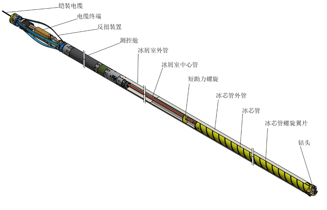深冰芯钻探装备主要包括日本Geo Tecs 公司生产的D-3型粒雪层干孔取芯钻机和中国极地研究中心与日本Geo Tecs 公司联合研制的CØ×HINARE/JARE型深冰芯钻机。其中粒雪层干孔取芯钻主要用于在冰盖上覆粒雪层中形成先导孔,随后扩孔下入套管,为后续需填充钻井液的深冰芯钻探做准备;深冰芯钻机则用于进行粒雪层以下的冰层取芯钻进。以上两种钻具均属于孔底动力钻具,由铠装电缆进行钻具供电和提放。