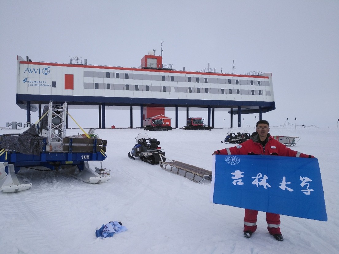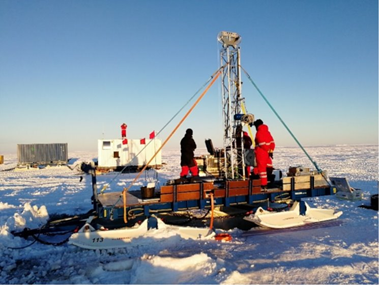 2017年我校范晓鹏老师携带自主研发的振动式冰下沉积物取样器参加了由德国阿尔弗雷德·韦格纳研究所(Alfred Wegener Institute, AWI)组织的“东南极Ekström冰架热水钻探”项目,开展了该振动器的南极现场试验。此次试验地点为Ekström冰架,距离诺伊迈尔三站(Neumayer Ⅲ)约2km,冰架厚度约200m。试钻期间,利用德国AWI热水钻机完成了两个冰架热水钻孔施工,之后通过AWI浅层沉积物取样器、UWITEC锤击取样器和JLU振动取样器获取了冰下样品。