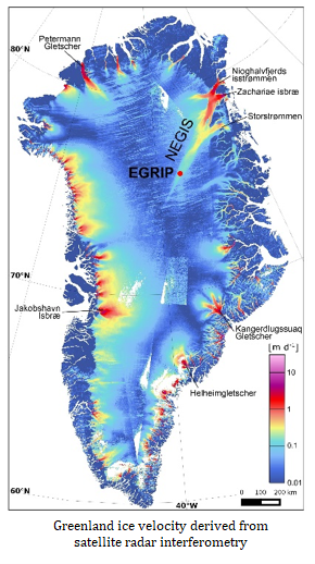 东北格陵兰冰流(Northeast Greenland Ice Stream , NEGIS )是格陵兰岛上最大的冰流。它源于中央分冰岭,以楔形形状穿过冰盖至下游近1000 km,通过三条大冰流流入海洋。分冰岭上冰流的流动是由冰盖底部强烈的融化触发的。科研人员主要使用深冰芯钻探方法,通过对冰芯流变性和变形性的研究以及对基底滑动、井孔变形和基底水流过程的观察,开展冰流动的动力学研究。