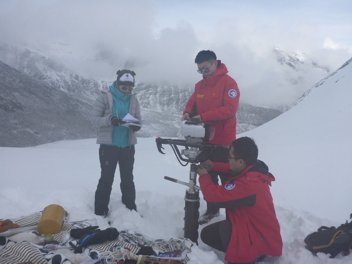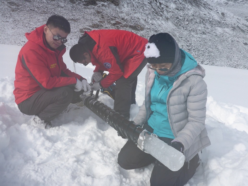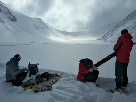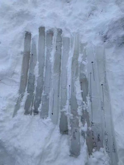 2019 年 11 月,吉林大学极地研究中心与中国科学院天山冰川观测试验站合作,在海拔 3800-4000 米的新疆天山 1 号冰川,开展了自研手摇/汽油机驱动螺旋取芯钻具的取芯能力测试。在冰川横、纵方向选取 9 处钻探点位,孔内 0.5 米处实测温度约为-3°C。本次测试总取芯长度达 12.39 米,单孔取芯长度均超 1 米,最长可达 2.5 米,钻进速度最高为 30 米/小时,钻具整体测试取得圆满成功。不过受冰川环境温度影响,测试期间黑色螺旋管易吸热导致冰屑融化,进而造成卡断器冻结失效。此次野外测试为后续汽油机驱动螺旋取芯钻具的优化升级提供了实践依据。