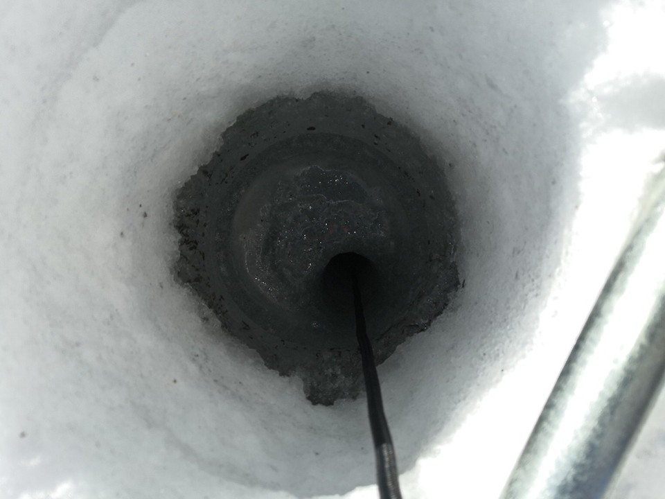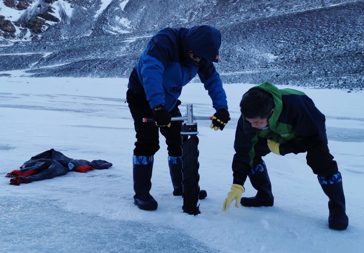 此次考察中,采用手摇螺旋取芯钻、小直径热融钻在冰川上进行了钻孔观测,其中手摇螺旋取芯钻主要通过冰芯观测浅冰层含砂情况,小直径热融钻用于测定冰川较深处含砂情况,评估其是否适用于热融钻探试验。此次热融钻探深度为9m。