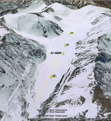 木斯岛冰川位于中国和哈萨克斯坦两国交界处萨吾尔山北坡,距离中国科学院西北生态环境资源研究院阿尔泰山站约50 km,从阿尔泰山站至冰川末端的道路维修后,车辆可达距离冰川末端约300 m处,且该段路为河床区,虽多为碎石,但是相对较为平整,相对容易到达。冰川末端冰面相对平整,无冰塔林,物资运输相对简单。